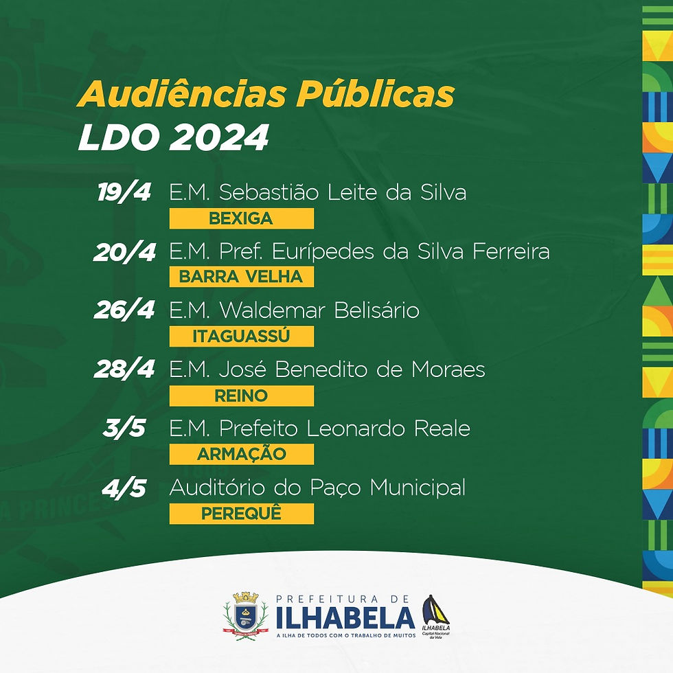 A Prefeitura de Ilhabela inicia nesta quarta-feira (19), às 18h30 na EM Sebastião Leite da Silva, no bairro do Bexiga, o programa “Prefeito Bairro a Bairro: seu lugar de fala”, com encontros nas localidades para aproximar o poder público da comunidade. Os seis primeiros encontros serão destinados às Audiências Públicas da Lei de Diretrizes Orçamentárias (LDO) para o exercício de 2024. A escola fica localizada na Rua João Leite dos Santos, 333 no Bexiga.